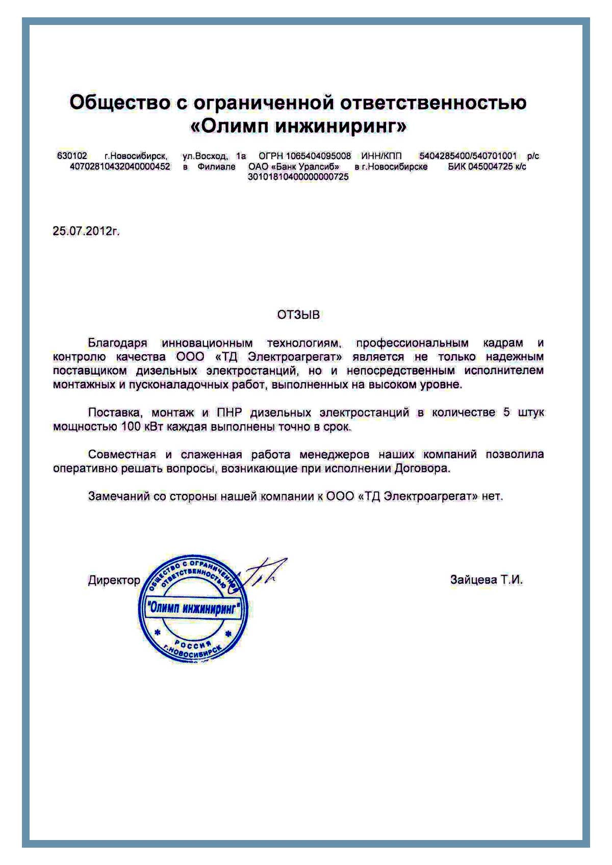 [ALT] => Отзыв контрагентов о компании ООО «ТД Электроагрегат» и исполненном проекте для ООО "Олимп инжиниринг", г. Новосибирск